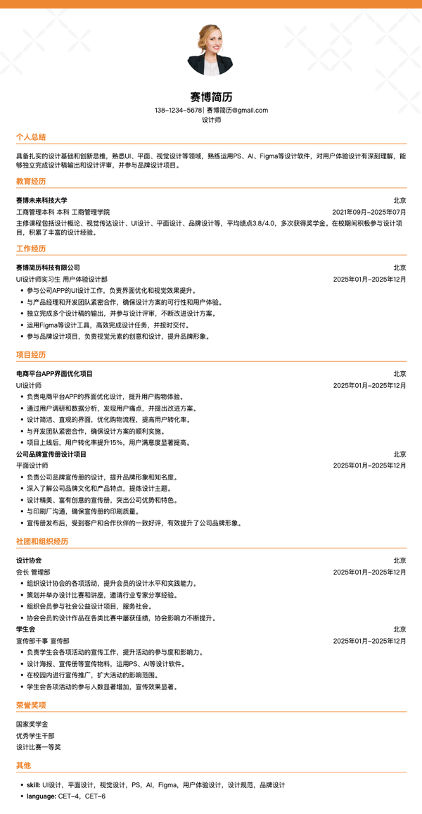 本模板专为拥有5-10年丰富设计经验的高级设计师量身定制,采用现代化设计风格,突出展示您的核心设计能力与项目成果。模板结构清晰,重点突出工作经历中的设计项目、团队协作经验以及设计理念的实践应用。适合投递互联网公司、广告公司、品牌设计机构等各类设计相关岗位。模板设计注重视觉呈现与内容平衡,能够有效展现您的专业水准和职业素养,帮助您在众多求职者中脱颖而出,获得HR和设计总监的青睐。
