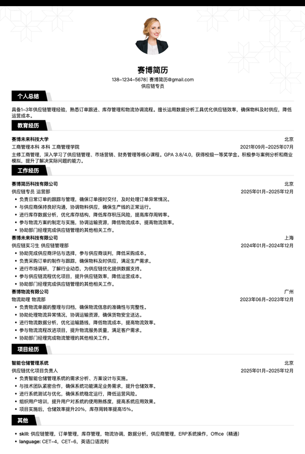 本简历模板专为1-3年经验的采购专员精心设计,采用商务专业版式布局,突出采购能力、供应商管理、成本控制等核心能力。模板结构清晰,能够有效展示采购项目经验、采购成果、成本优化等关键信息。无论是投递采购专员、供应链专员、采购助理等相关岗位,都能帮助求职者快速呈现采购能力和专业水平,提升简历通过率。