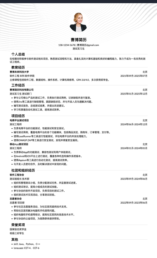本简历模板专为2025届测试工程师应届生量身定制,采用简洁清新的版式设计,突出测试基础知识、实习经历、学习能力等核心优势。模板结构合理,能够清晰展示测试项目经验、测试工具使用、自动化测试能力等关键信息。无论是投递测试工程师、QA工程师、测试实习生等相关岗位,都能帮助应届生系统呈现专业能力和学习潜力,让HR快速了解你的技术基础和发展潜力。