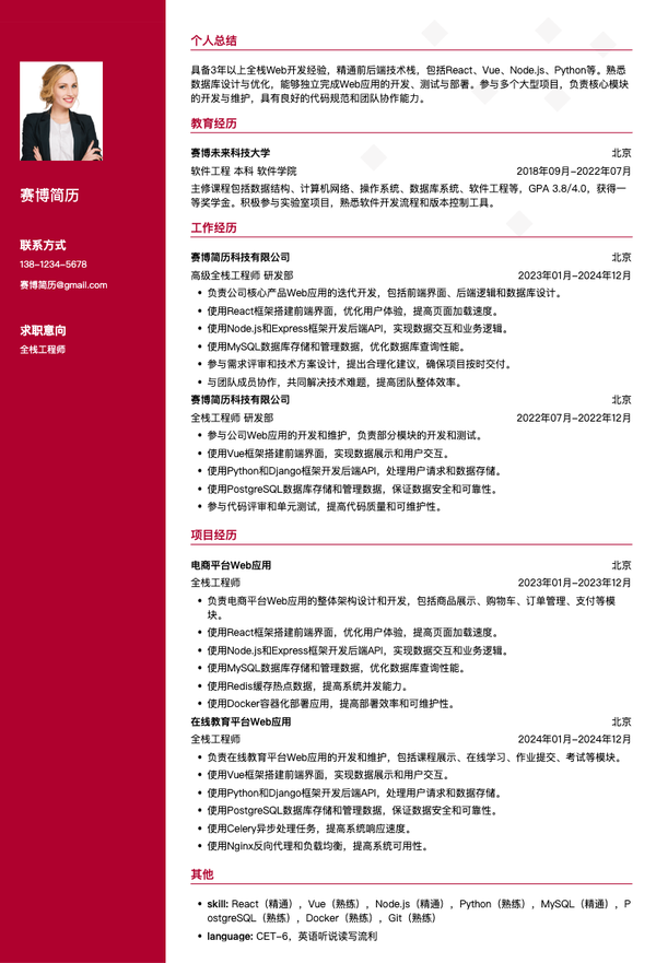 本简历模板专为5-10年经验的研发经理精心设计,采用高级技术管理版式布局,突出研发管理、技术领导、团队建设等核心能力。模板结构清晰,能够有效展示研发团队管理经验、技术架构设计、项目交付成果等关键信息。无论是投递研发经理、技术经理、研发总监等相关岗位,都能帮助求职者快速呈现管理能力和技术领导力,提升简历的专业度和竞争力。
