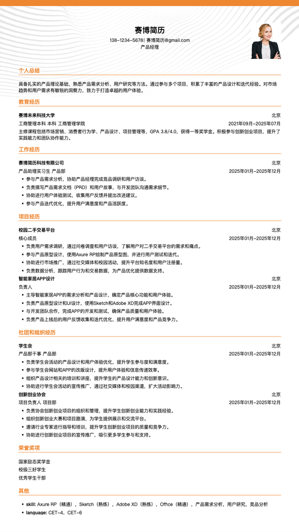 本简历模板专为产品助理实习生量身定制,采用简洁清新的版式设计,突出产品思维、学习能力、项目经验等核心优势。模板结构合理,能够清晰展示产品相关项目、实习经历、产品分析能力等关键信息。无论是投递产品助理实习、产品经理实习、产品运营实习等相关岗位,都能帮助实习生系统呈现产品能力和学习潜力,让HR快速了解你的专业基础和发展潜力。