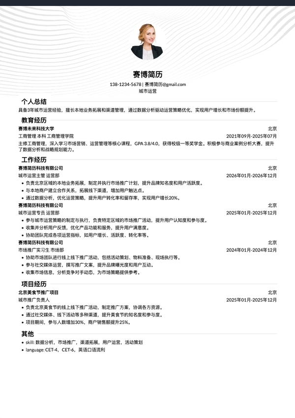城市运营经理简历模板 | 免费互联网简历制作下载_赛博简历