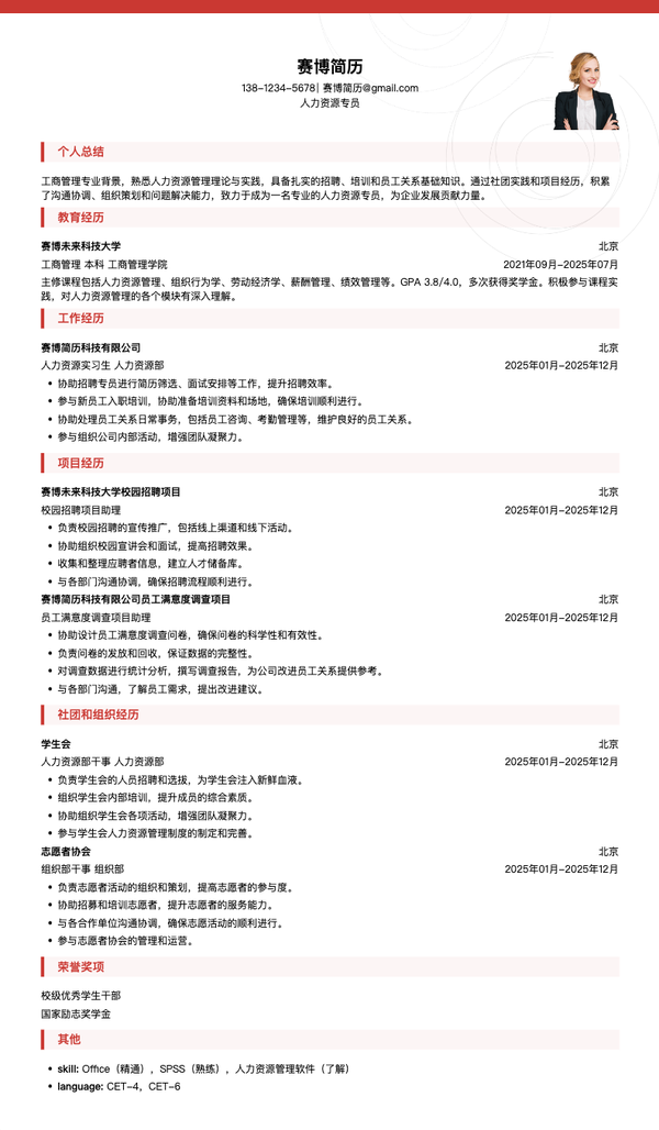 本简历模板专为人力资源专员应届生精心设计,采用HR专业版式布局,突出人力资源、招聘能力、学习能力等核心优势。模板结构清晰,能够有效展示HR相关项目经验、实习经历、招聘能力等关键信息。无论是投递人力资源专员、招聘专员、HR助理等相关岗位,都能帮助应届生快速呈现HR能力和专业素养,提升简历竞争力。