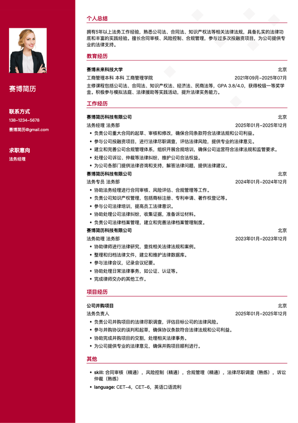 法务经理简历模板 | 免费法律简历制作下载_赛博简历