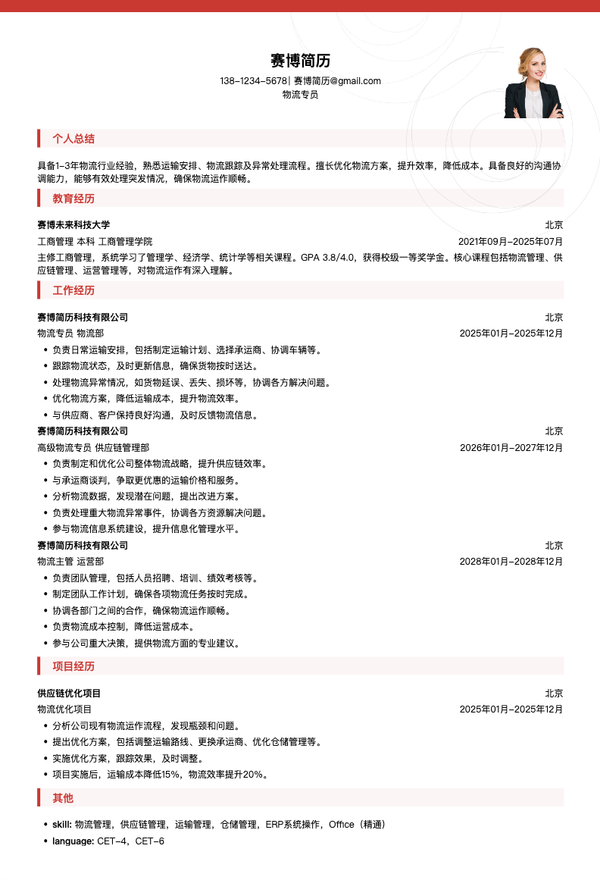本简历模板专为1-3年经验的物流专员量身定制,采用商务专业版式设计,突出物流管理、仓储管理、配送协调等核心能力。模板结构合理,能够清晰展示物流项目经验、物流优化、配送效率等关键信息。无论是投递物流专员、仓储专员、配送专员等相关岗位,都能帮助求职者系统呈现物流能力和项目成果,让HR快速了解你的专业水平。