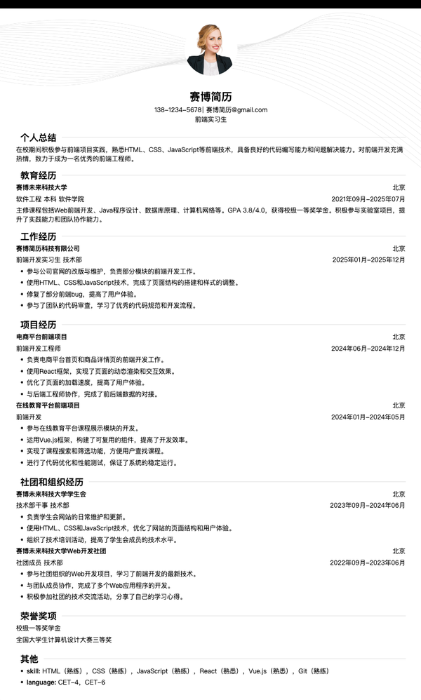 前端实习生简历模板 | 免费互联网简历制作下载_赛博简历