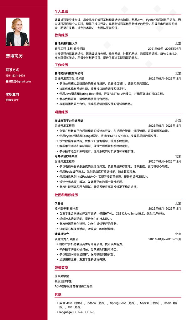 后端实习生简历模板 | 免费互联网简历制作下载_赛博简历