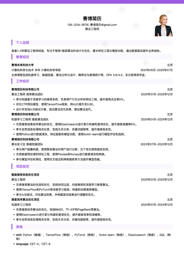 算法工程师简历模板 | 免费互联网简历制作下载_赛博简历
