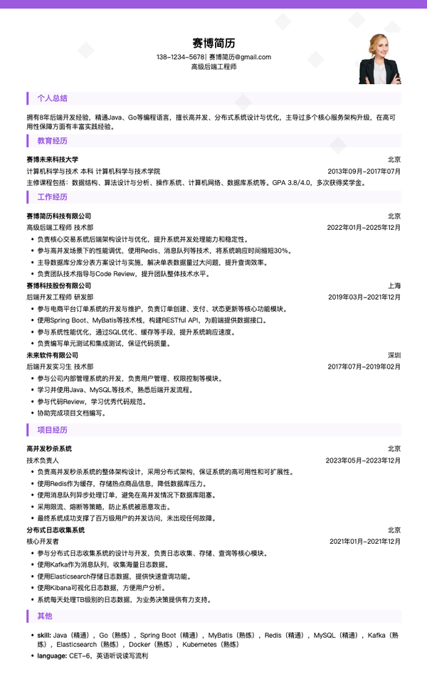 高级后端工程师简历模板 | 免费互联网简历制作下载_赛博简历