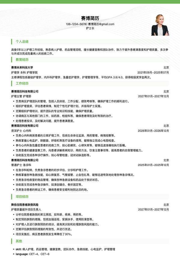 本简历模板专为3-5年工作经验的外科护士精心设计,采用医疗专业版式布局,突出外科护理、护理技能、专业能力等核心能力。模板结构清晰,能够有效展示外科护理经验、护理技能、专业成就等关键信息。无论是投递外科护士、外科护理师、护士等相关岗位,都能帮助求职者快速呈现护理能力和专业水平,提升简历通过率。