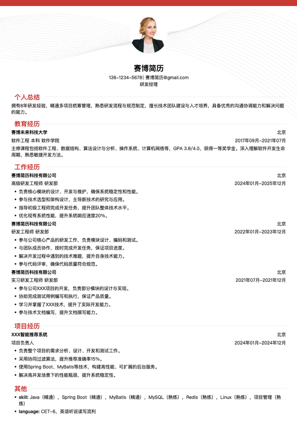 本简历模板专为5-10年经验的产品总监精心设计,采用高级管理层的版式布局,突出产品战略、团队管理、业务增长等核心能力。模板结构清晰,能够有效展示产品团队管理经验、产品战略规划、业务成果等关键信息。无论是投递产品总监、产品VP、高级产品经理等相关岗位,都能帮助求职者快速呈现管理能力和战略思维,提升简历的专业度和竞争力。