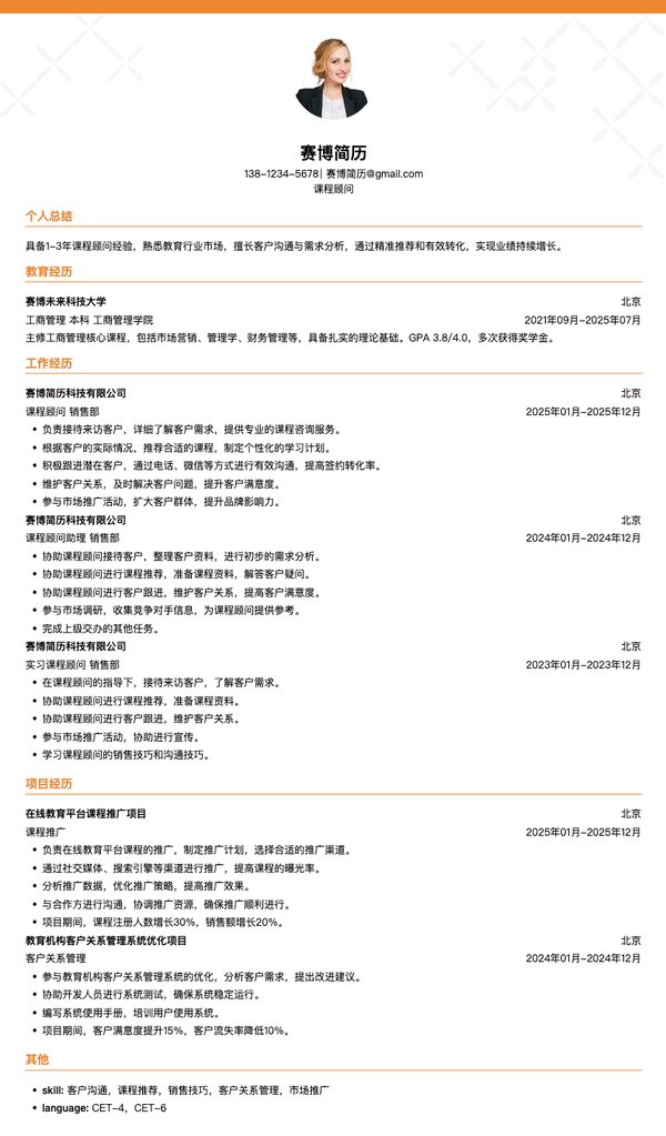 本简历模板专为2025届客服专员应届生量身定制,采用服务专业版式设计,突出客户服务、沟通能力、学习能力等核心优势。模板结构合理,能够清晰展示客服相关项目经验、实习经历、服务能力等关键信息。无论是投递客服专员、客户服务、在线客服等相关岗位,都能帮助应届生系统呈现服务能力和专业素养,让HR快速了解你的专业基础和发展潜力。