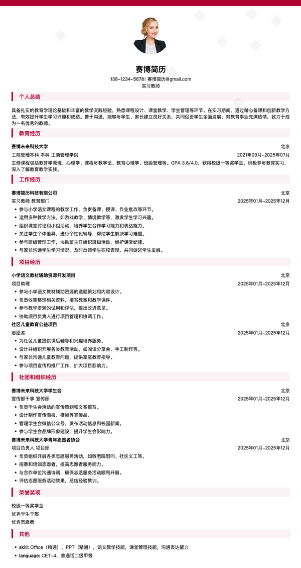 本模板专为拥有5-10年丰富教学经验的高级教师设计,突出展示教学成果、教研能力和教育理念。模板结构完整,重点呈现教学经历、所获荣誉、教研成果以及学生培养成果。适合投递各类学校、教育机构的高级教师、学科带头人等岗位。模板设计庄重专业,能够有效展现您的教学水平和教育情怀,帮助您在教育行业求职中展现专业优势,获得学校领导和HR的认可。