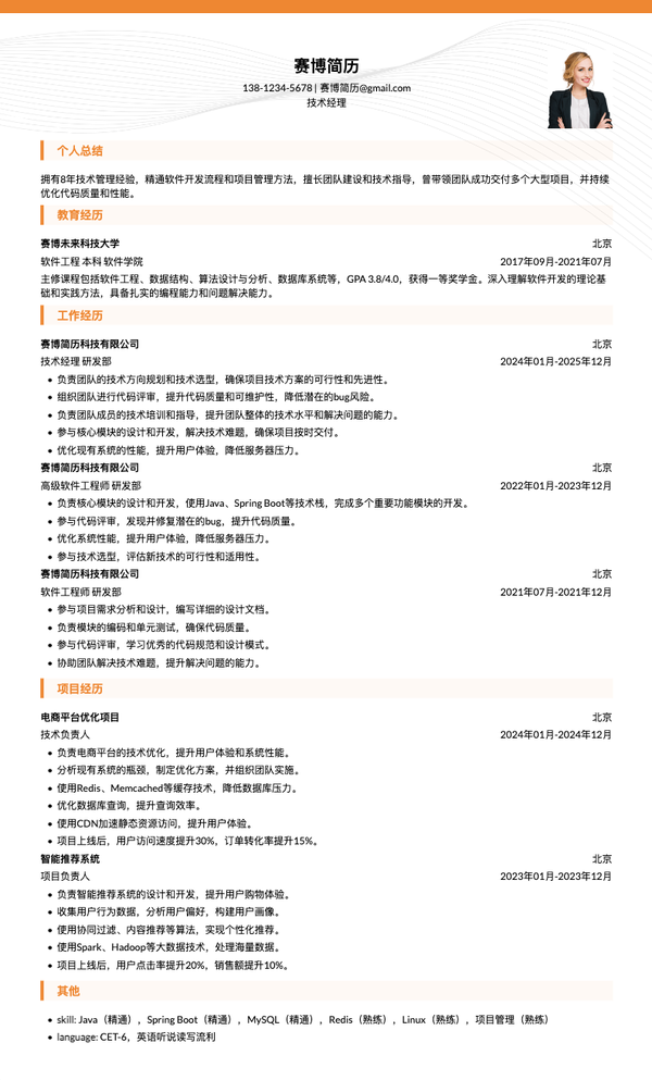 本简历模板专为5-10年经验的研发经理精心设计,采用高级技术管理版式布局,突出研发管理、技术领导、团队建设等核心能力。模板结构清晰,能够有效展示研发团队管理经验、技术架构设计、项目交付成果等关键信息。无论是投递研发经理、技术经理、研发总监等相关岗位,都能帮助求职者快速呈现管理能力和技术领导力,提升简历的专业度和竞争力。